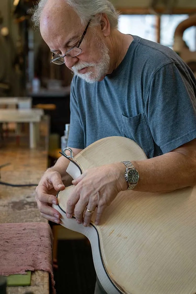 The ideas continue, and they come easily, but bringing them to fruition is really the difficult part. I just designed a smaller body that is 15-3/4 inches, just under the 16 that I normally do. I will design something new if I see the need for it, and if a particular client is asking me to do it, I will investigate it. I’ll make sketches, drawings, and templates. But ultimately, I like to get the material out there on my workbench and let it tell me where it wants to go. I’m listening to the material. There’s a constant flow of decisions being made as you’re building. That process never stops.