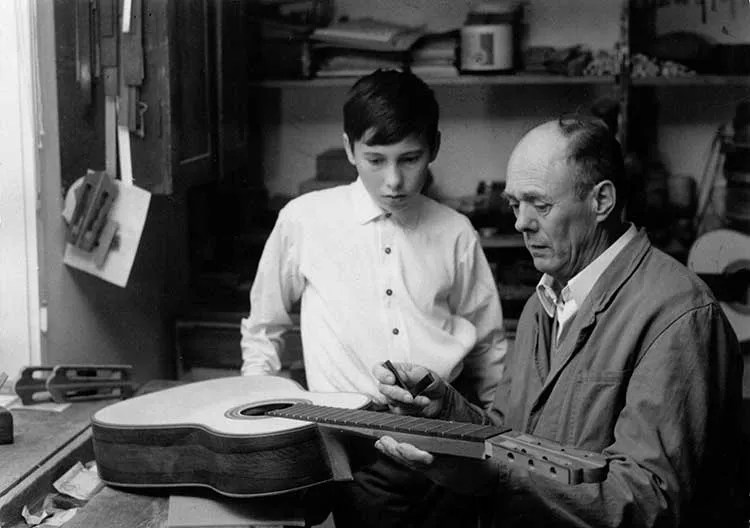 Josef Hauser, son of a Bavarian innkeeper in Burghausen, Germany, was the first luthier in the family. While in his 20s, he gained acclaim as a performer on the zither, a multi-stringed folk instrument popular in Bavaria in his era, and composed some 400 works for the instrument. Hauser later began building zithers, guitars, mandolins, violins, and lutes. His son, Hermann Hauser I, worked in the shop, but was also trained at the Staatliche Geigenbauschule (State School of Violin Making) in Mittenwald. Until the 1920s, his guitars were built in the Viennese and Munich styles, as were his father’s—the latter having a small body and narrow waist; the former, wider shoulders