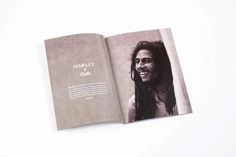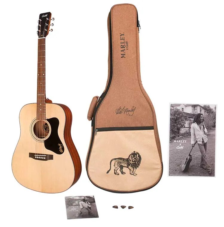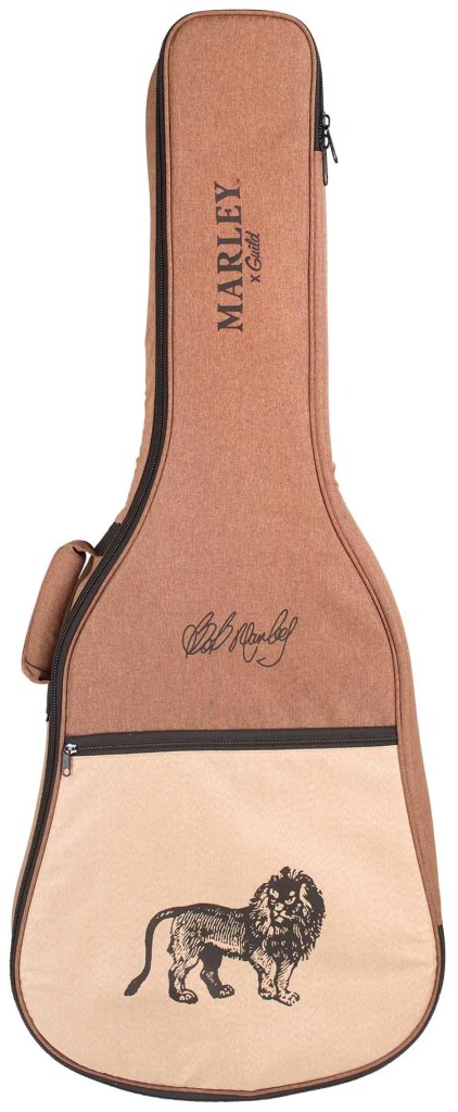 Rounding out the package are some customized accessories: a gig bag decorated with a lion insignia and made from recycled nylon, a nod to Marley’s environmentalist values; a small black-and-white poster of Marley; three guitar picks emblazoned with the Marley logo; and a booklet that tells the story behind the guitar and offers a chord chart for the classic Marley song “Three Little Birds.” Also in line with the late Marley’s green ideals is Guild’s partnership with the charity One Tree Planted, which has committed to planting a tree for every guitar that’s made.