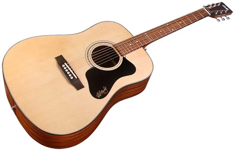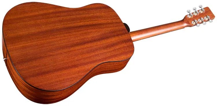 BODY Dreadnought shape; solid Sitka spruce top with scalloped X-bracing; mahogany back and sides; bone saddle with 2-1/8″ string spacing; pau ferro bridge; satin polyurethane finish