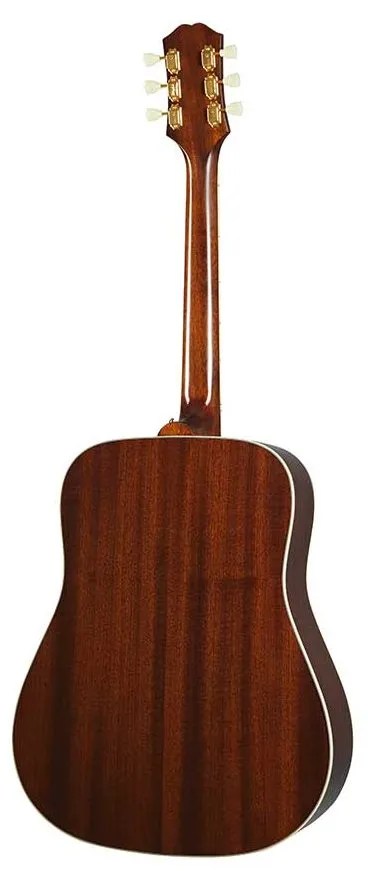 The basic Hummingbird recipe, first cooked up in 1960, is not especially complex: solid Sitka spruce top; mahogany back, sides, and neck; and vibrant cherry sunburst or natural finish, all of which are identical on Epiphone’s new iteration of the Hummingbird. What’s different about the Epiphone Hummingbird? Not a lot. OK, the nut width is slightly slimmer than the original Gibson’s 1.72 inches, but only by a fraction, at 1.69. The Epiphone’s fretboard and bridge are made of Indian laurel, rather than rosewood, and, as would be expected, the guitar has a polyurethane finish, as opposed to nitrocellulose lacquer.