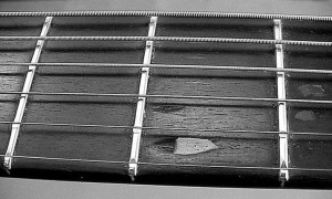 A bowed neck is easy to diagnose. Stop a string at the first fret with your fretting hand, and use your other hand to stop the same string at the 14th fret. This positions the tensioned string as a straight-line reference, which can be used to determine neck curvature. Look at the seventh- and eighth-fret positions to see how much space there is between the fret tops and the underside of the string. For most playing styles, a gap somewhere around the thickness of a business card is ideal. If the neck has a significant forward bend, a competent luthier can use a variety of techniques to straighten it out, including heating or refretting with larger-tang fretwire.