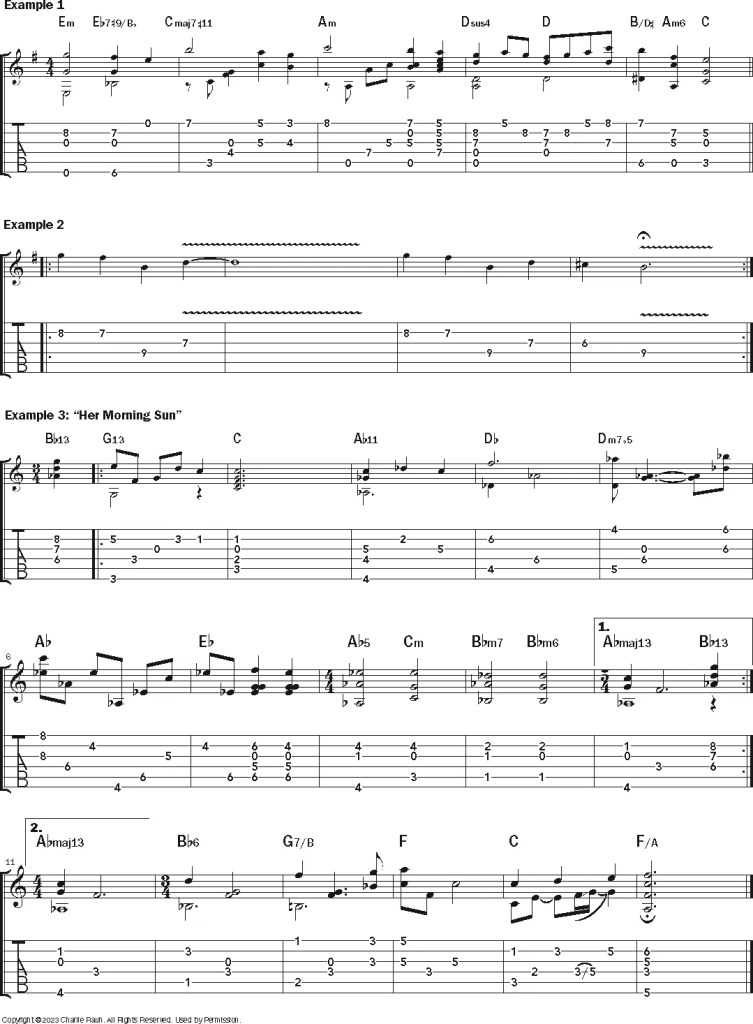 In Example 2, you can hear the linear, single-note melody played twice. Performing exposed and unadorned melodies as a soloist can be a daunting task, which underscores the importance of maintaining a solid foundation. When your notes have a clear origin and a well-defined purpose, you deliver music that feels whole, substantial, and fully realized.
