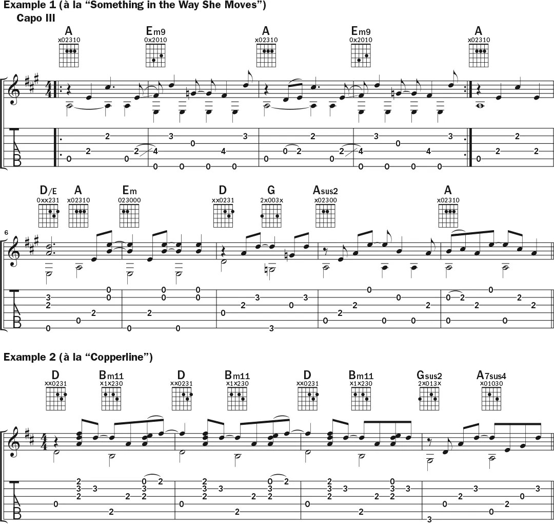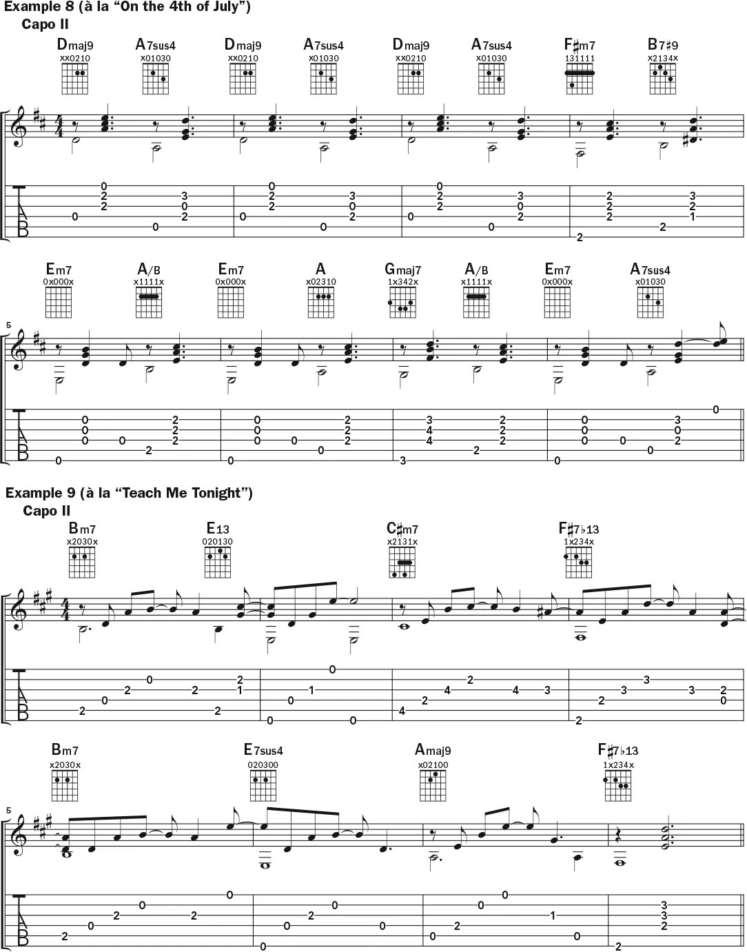 The last example in this lesson is based on his version of “Teach Me Tonight,” written in the ’50s by Gene de Paul and Sammy Cahn. Taylor’s recording on American Standard has two guitar parts, one supplying soft bossa-style chords and the other playing more ringing arpeggios. Example 9 is based on the latter part, with a sweet-sounding set of chords that—unlike with typical jazz guitar—mostly use open shapes. In measure 5, hold a Bm7 and move the bass note over to the sixth string for the E7sus4—a characteristic JT move. The open Amaj9 voicing in measure 7 is another chord that instantly marks this as a Taylor arrangement.