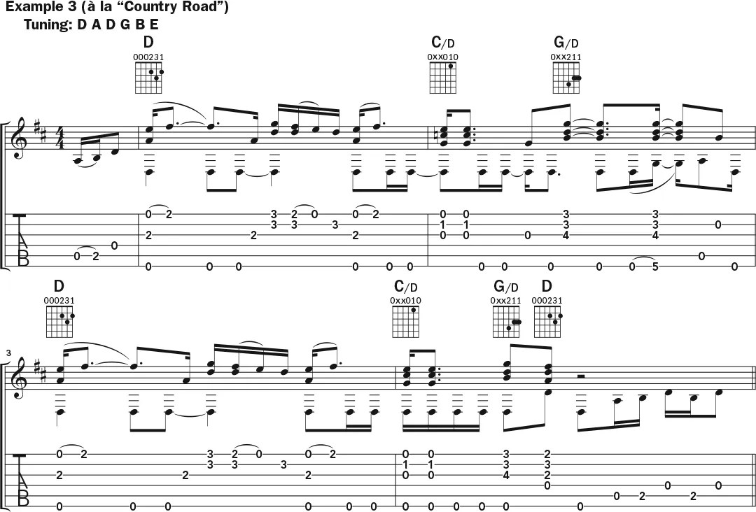 While Taylor mostly sticks with standard tuning, he does sometimes use dropped D—notably on “Country Road.” Example 3 is based on the “Country Road” intro. After an opening bass run, play the D chord pull-off/hammer-on riff that he uses, with many variations, throughout his repertoire. He applies the same basic pattern to the A chord. Except for the quick bass runs at the ends of measures 2 and 4, play the low D as a pedal tone throughout, as the chord above it changes from D to C to G. The resulting C/D and G/D are two examples of pianistic slash chords, as used elsewhere in this lesson.