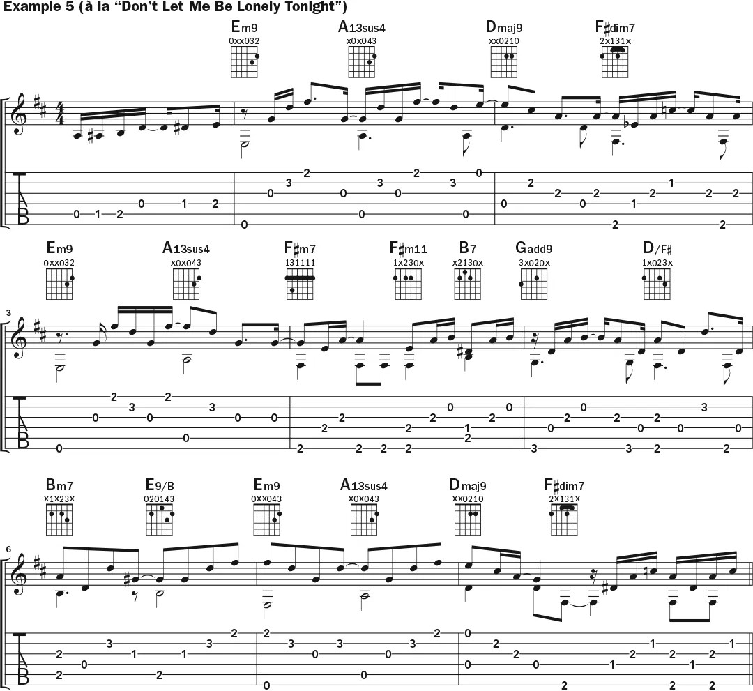 Another early song that showcases Taylor’s elegant use of extended chords is “Don’t Let Me Be Lonely Tonight,” released in 1972 on One Man Dog. Example 5, based on the first part of the verse, opens with an Em9 that is a common Taylor shape. Don’t bother fretting the fifth string, since you’re not playing it. Keep your fretting fingers in place on the top two strings, and move the bass note to the open fifth string, for the A13sus4. Then a lovely Dmaj9 to F#dim7 change brings you back around to the Em9 and the next turn of the wheel.