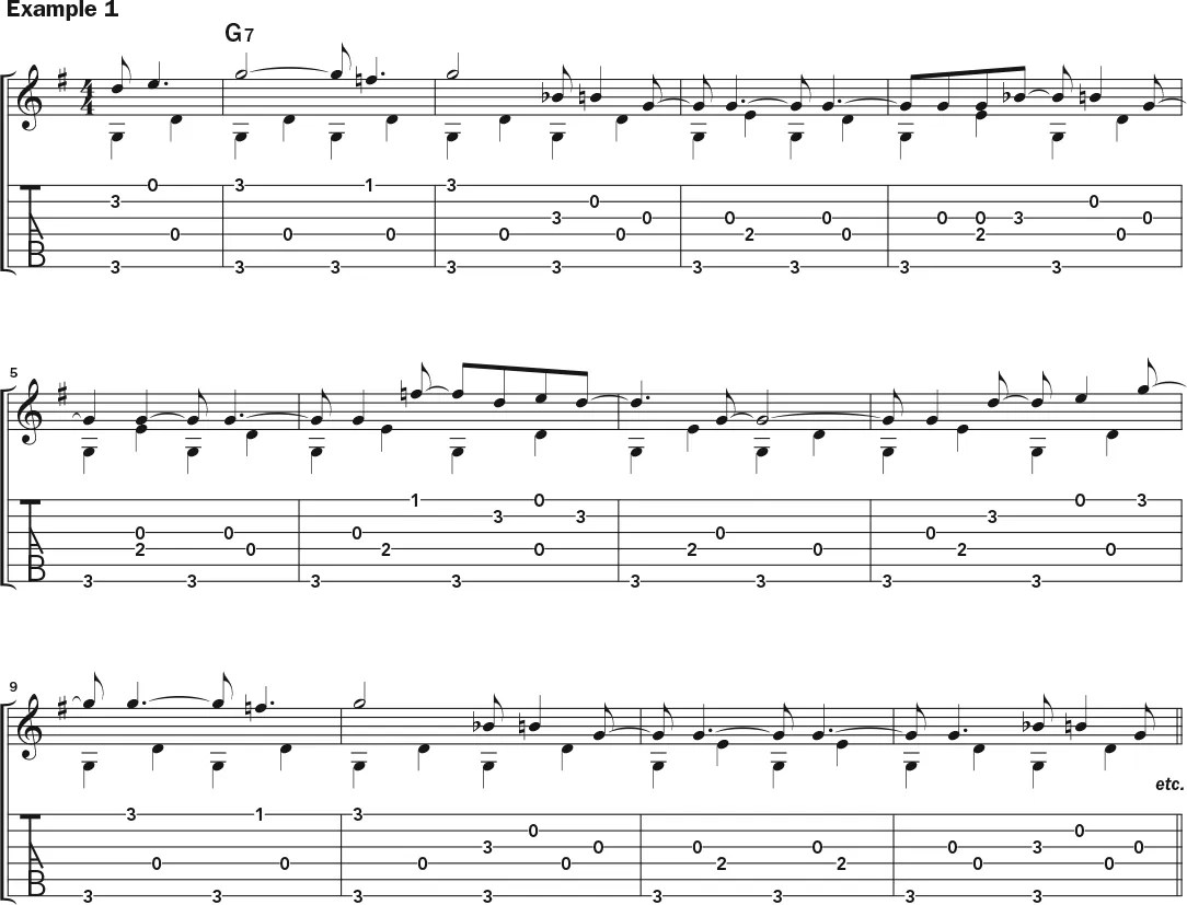 In Example 1 Sebastian plays patterns inspired by “Spike Driver Blues,” Hurt’s classic one-chord take on the John Henry ballad. Sebastian frets the low G with his third finger throughout. In his interpretation, he does a bass line alternating steadily between the sixth and fourth strings. As for the melody notes, he frets the first-string G, as well as the second (third-fret D) and flatted third (third-fret Bb) with his fourth finger; he grabs the first-string F with his first finger to form a G7 chord.
