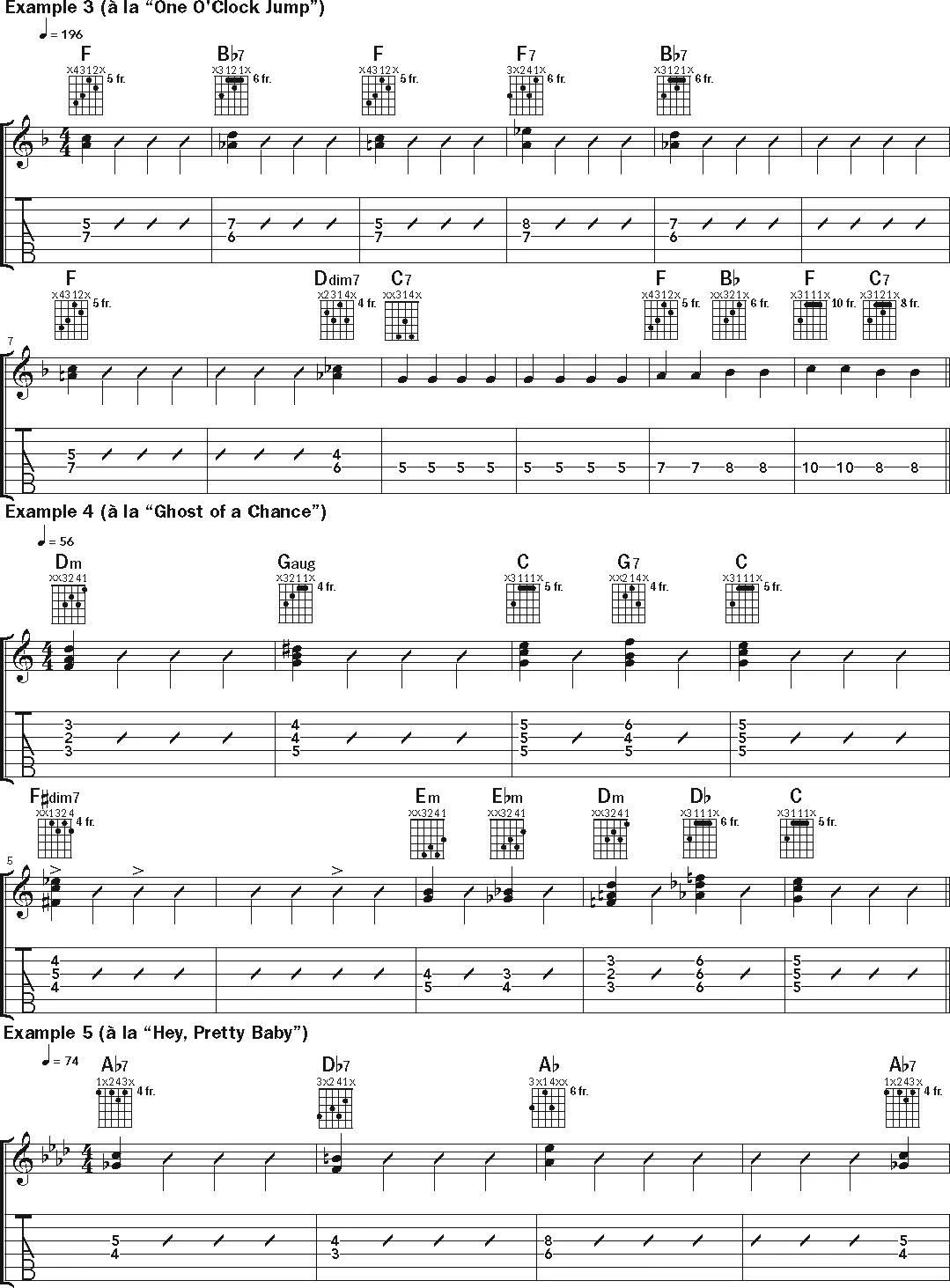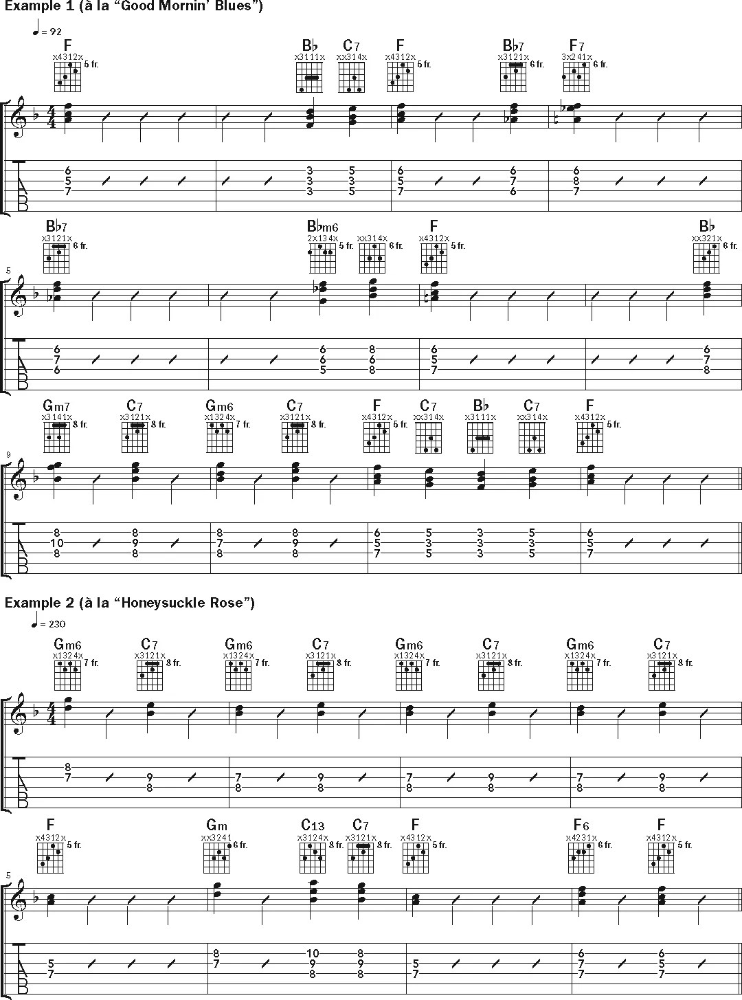 Now let’s explore a handful of examples of Green’s style based on Count Basie recordings from the Old Testament era. Begin by using the full chord shapes and playing each example slowly, to help understand Green’s chordal concepts. Continue by pruning down the chords, emphasizing as few as one note in each voicing. The goal is to have control over the entire fretboard and use the guitar both percussively and harmonically. The subtleties of Green’s approach are nearly impossible to capture in standard notation, so a close aural inspection of recordings is highly recommended. Also, in many cases, it can be challenging to clearly define what exactly Green is playing. He never penned a method book, but we can present some well-educated guesses based on study of audio and video recordings.