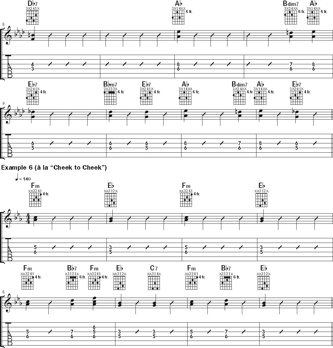 I’ll conclude with a stock chord progression found throughout the Great American Songbook—in this case in the bridge of Irving Berlin’s “Cheek to Cheek,” which the Basie orchestra recorded in the spring of 1949, less than nine months before the bandleader temporarily called it quits. Green can be heard occasionally peeking out from behind the bold arrangement, and his playing on the bridge a minute into the recording reveals the ideas used in Example 6. The movement from the ii chord (Fm) to the tonic (Eb) recalls the voice leading of Ex. 2. It’s a simple but effective way to navigate changes that every jazz guitarist sees regularly, with a reminder in bar 5 that by continuing to employ full chord forms you can occasionally add some additional harmonic movement, even when primarily sounding two notes.