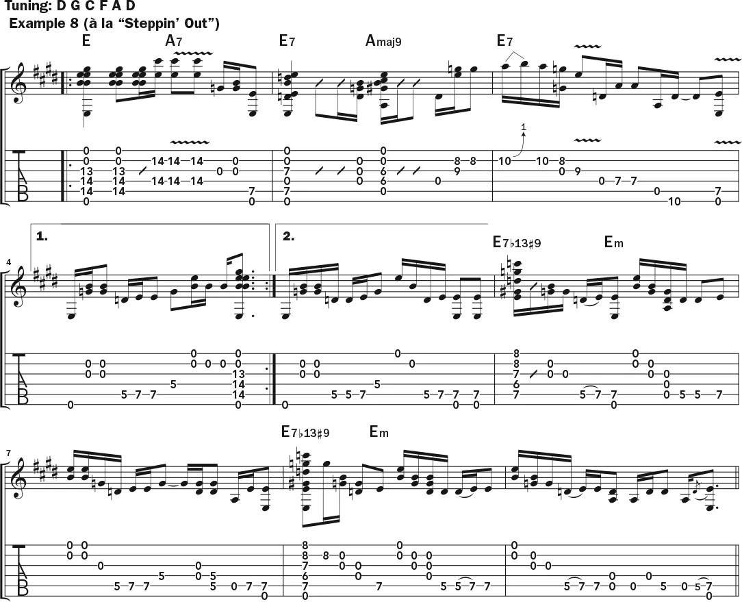 An excerpt from her solo is shown in Example 8. Start with E and A7 up at the 12th fret, and add rock-style (up and down) vibrato on the A7, which is easier with the low tuning. Then head down to the seventh and sixth frets in measure 2, followed by a single-note line in measure 3. Along the way, spice up the harmony with touches of Amaj9 (measure 2) and E7b13#9. Throughout the solo, Armatrading plays hard, with plenty of additional percussion and open strings. As you work through the example, focus more on the overall feel than on re-creating every scratch and note.