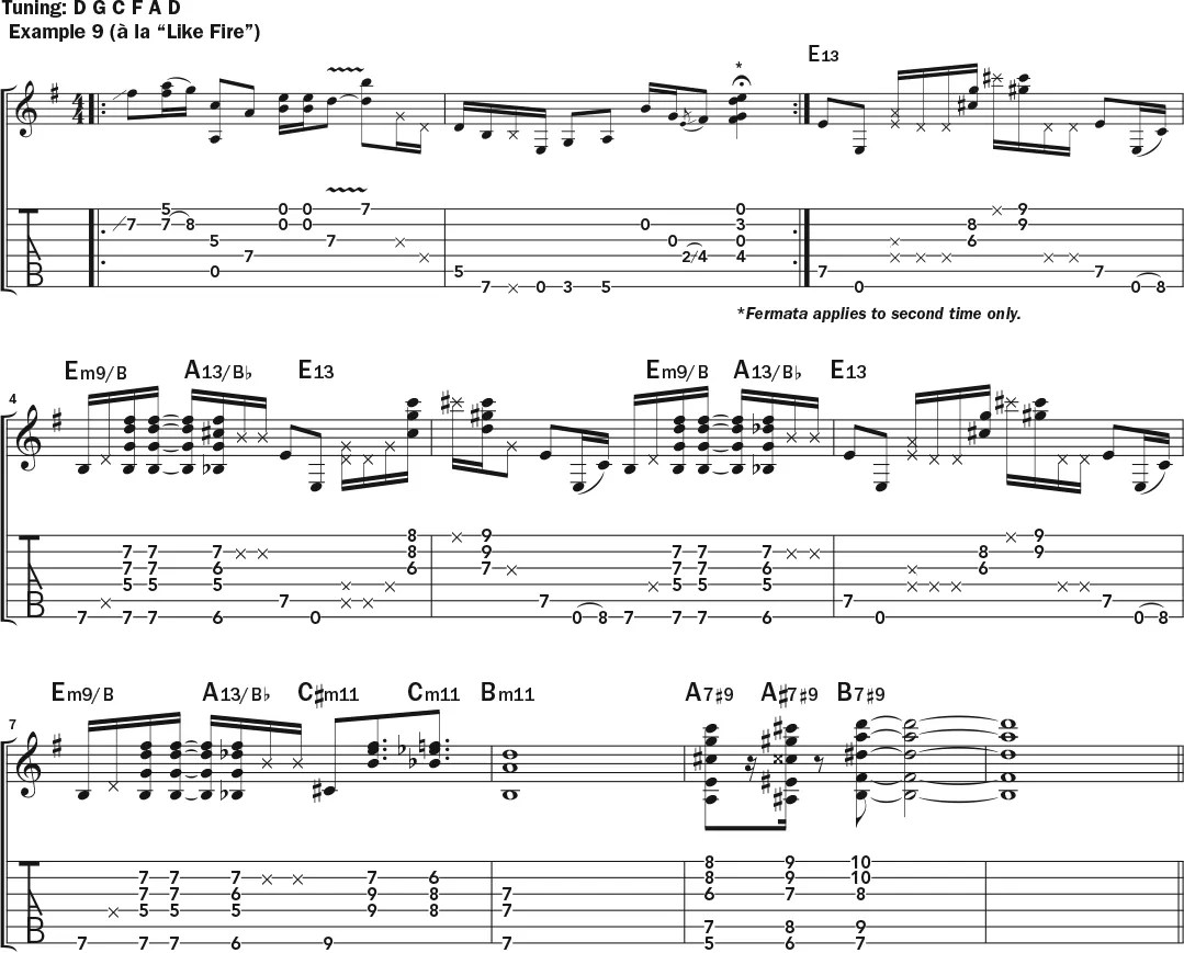 One of Armatrading’s most arresting guitar moments on record is the intro to “Like Fire,” from Show Some Emotion. In Example 9, again in the low tuning, open with a bluesy passage played mostly around the fifth fret. The harmony is ambiguous here, with hints of A minor and D but no obvious root chord. In measure 3, though, kick into the song’s sly, funky primary groove in E, as used in the verse. Notice how the repeating riff goes for six beats, so it starts at the beginning of measure 3, in the middle of measure 4, and again on the downbeat in measure 6.
