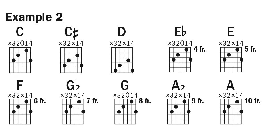 everyone’s version of that classic tune starts with this chord. It’s a great voicing for a number of reasons. First of all, it’s easy to play. Second, it has the root note in the bass—on the fifth string. Third, the four fretted strings provide all the notes of a major chord, and the fingering leaves a minimum of open strings to contend with. This is important as you start sliding fingerings up the neck (Example 2).