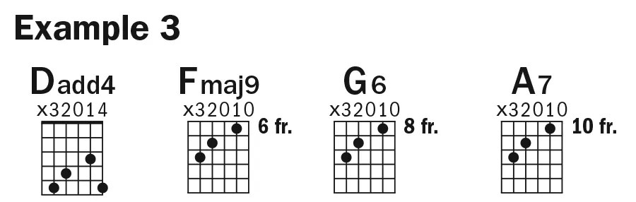 But with several of the chords, the open strings work beautifully as added color notes. And on some of these chords you can lift your fourth finger and include the open first string, as in Example 3. You might recognize the Dadd4 from Simon and Garfunkel’s “Kathy’s Song.”