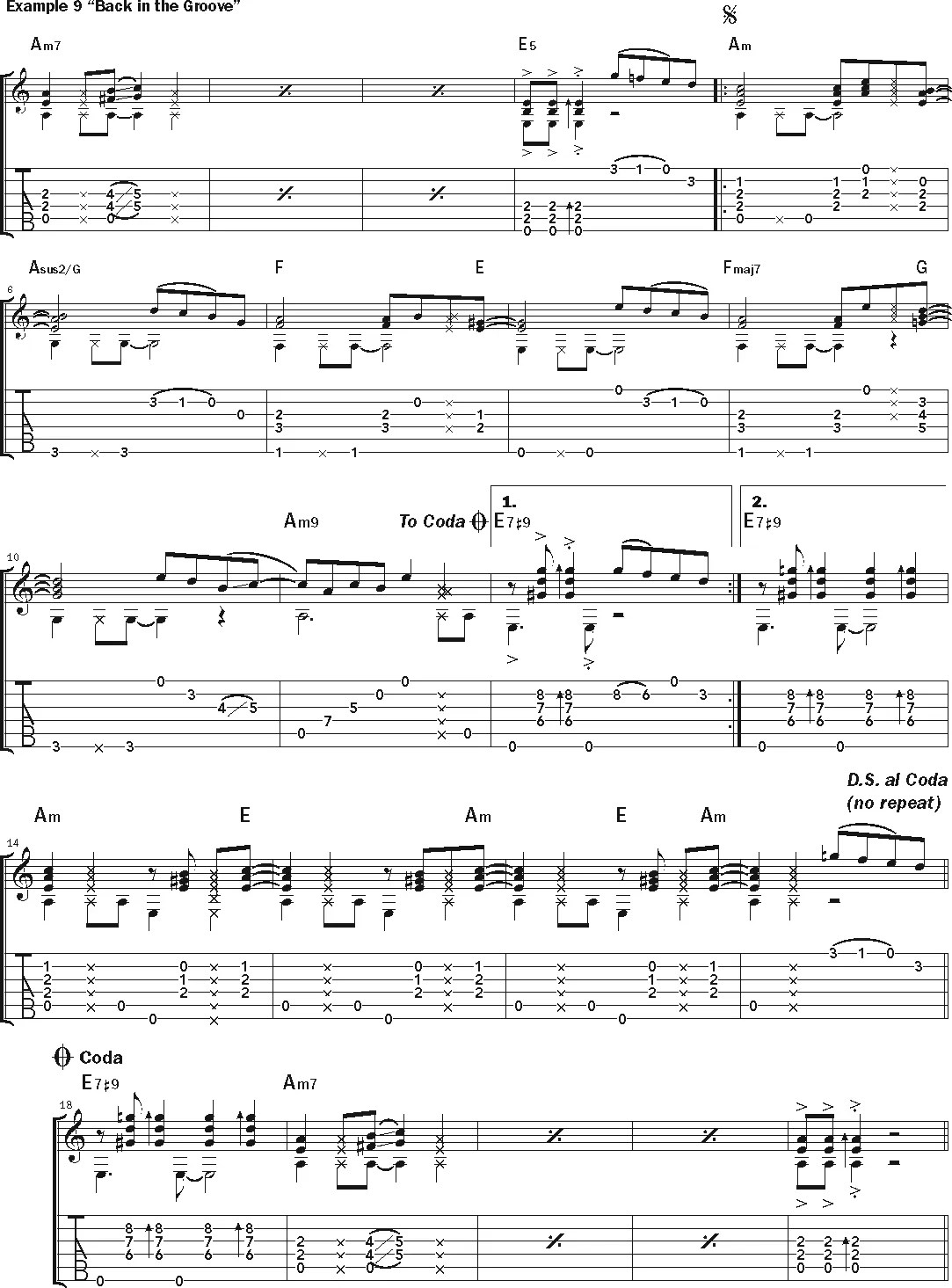 Now it’s time to put these techniques to work in a short solo guitar piece, “Back in the Groove” (Example 9). The groove from Ex. 3 serves as both an introduction and ending. The melody begins at measure 4, leading into a chord progression with a descending bass line. Notice that the eighth-note melody is inserted between the rhythm pattern and that the backbeat drops out during the melodic sequence as well. I’ve combined each of the percussive techniques we’ve discussed in “Back in the Groove,” sometimes switching approaches within the same measure. The choices I’ve made are comfortable to me, but other variations are possible, so experiment to discover what sounds and feels best to you.