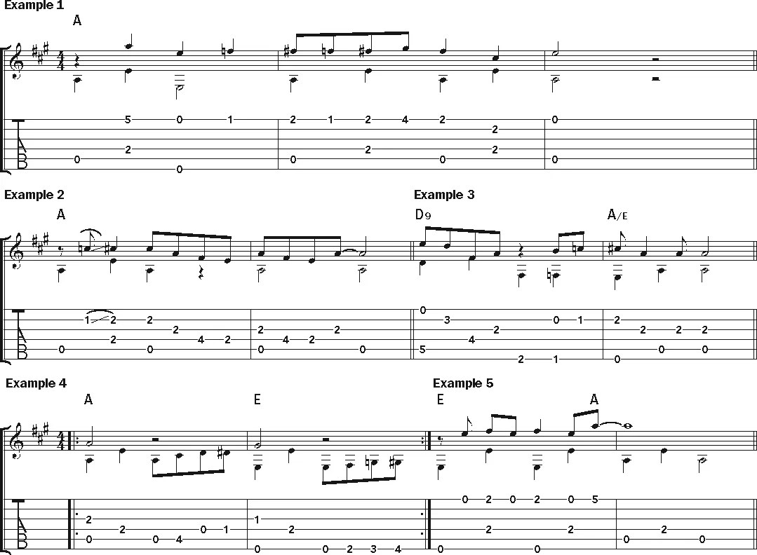 Another signature sound in early blues and ragtime songs involves the anticipation of a chord change, usually on the offbeat right before a new chord. In such instances, it’s important to fret not just the melody but the whole chord shape before the downbeat of the following measure. For instance, in the first measure of Example 5, on the “and” of beat 4, move to an open A chord with your fourth finger on the first-string A.