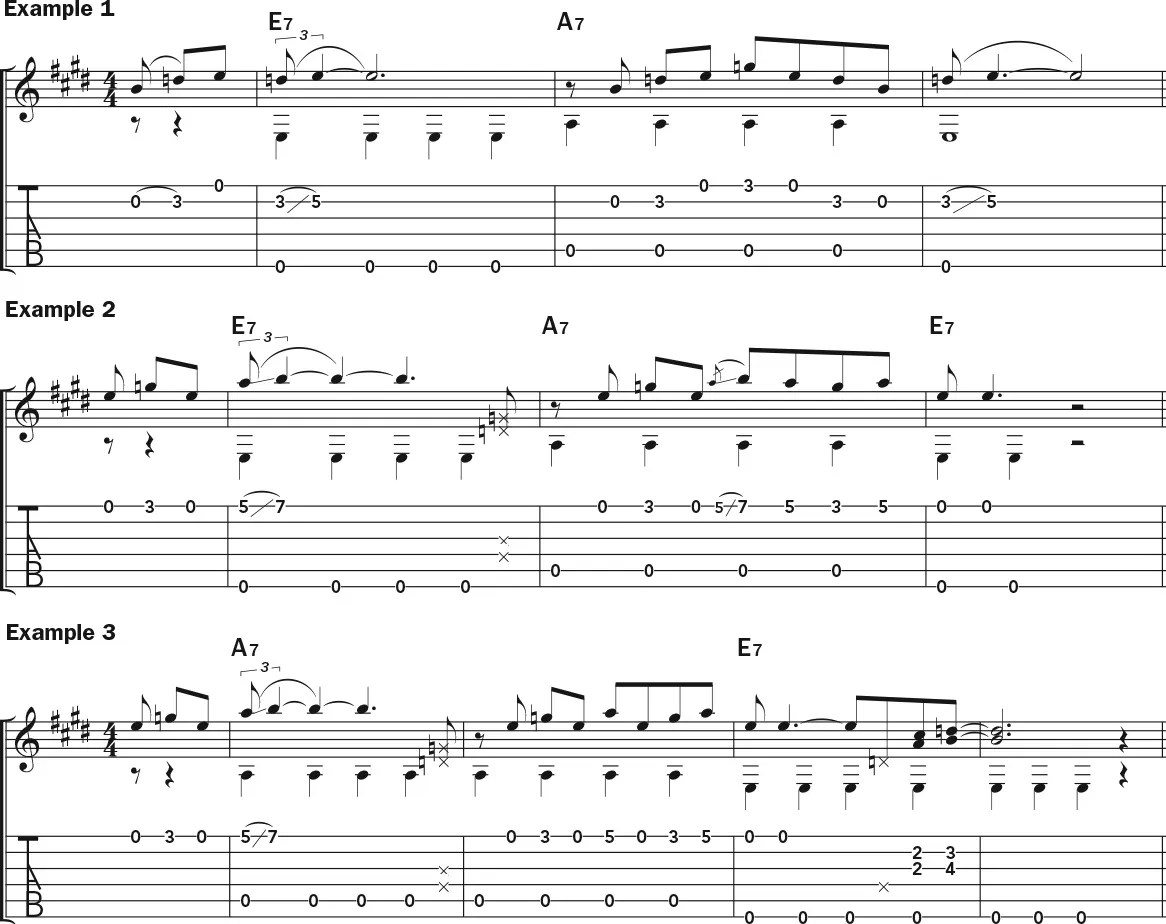 We could take a really simple pentatonic lick like shown in the pickup measure and first bar of Example 1, and turn it into a longer idea in the last two measures. Example 2 is based on the same idea, but at a higher pitch level. Because of the nature of the E minor pentatonic scale (E G A B D), an approach like this works over both the I and the IV chords, and Example 3 shows how to use it on the second four measures of the 12-bar form.