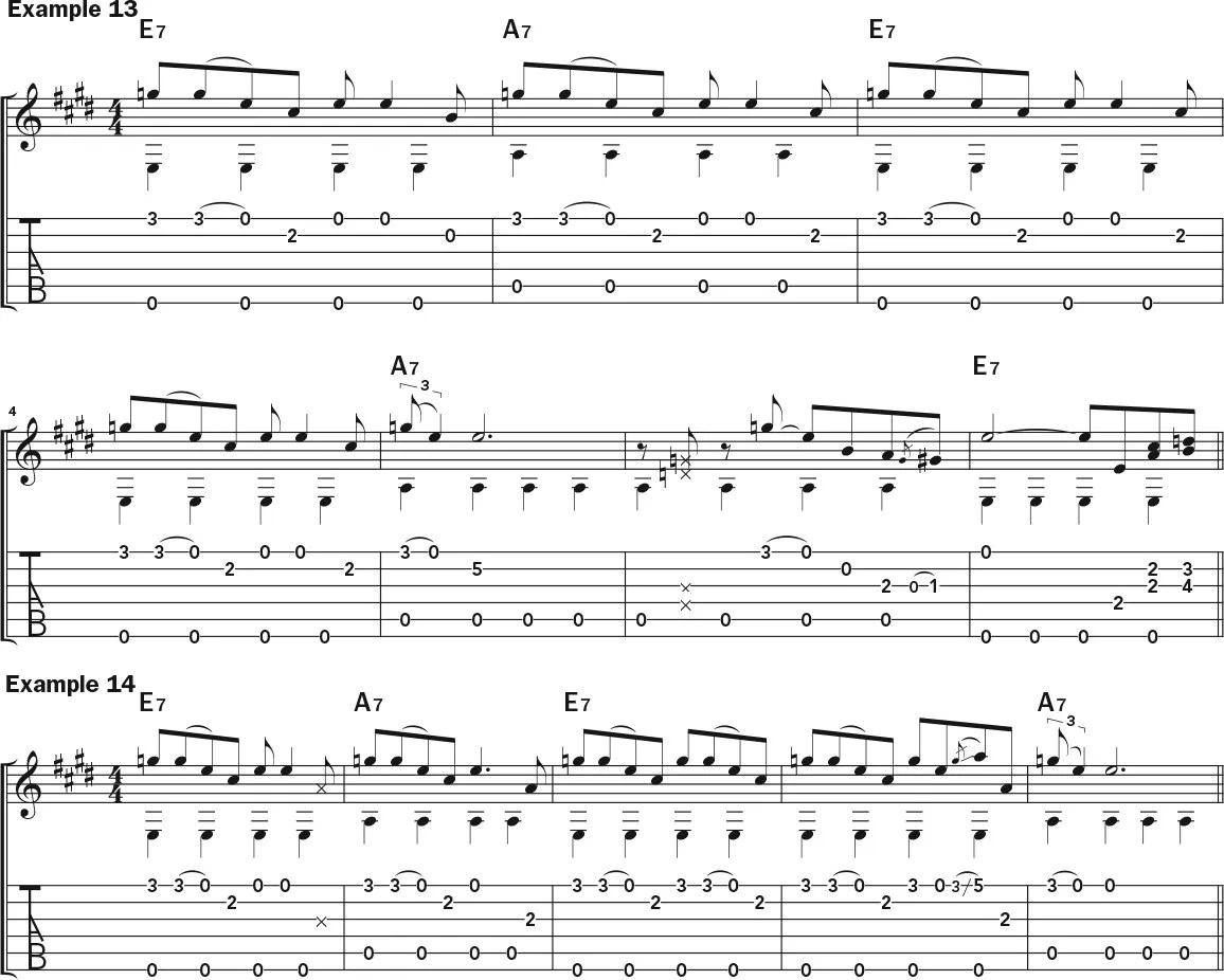 Variations like these leave plenty of room for some chord hits if you want them, and Example 11 shows where you might place them in the first eight measures of the 12-bar form. For the last four measures, you can use the same kind of rhythms, but you’ll have to switch up the notes to acknowledge the V chord (B7), as depicted in Example 12.