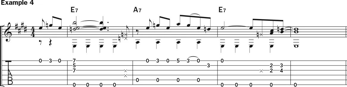 With a simple idea like that, you could also incorporate a bit of chord-voicing action. In Example 4, the downbeat of bar 1 places the flatted seventh (D) and root (E) under the fifth (B) for an E7 chord, and the lick ends with an echo resolution (an answer to a phrase) on a double stop (B–D) that implies E7. You could go through this with whatever lick you started off with, taking short phrases, building them into longer phrases and creating that call-and-response between the odd bars of the first two lines (measures 1–4 and 5–8) of the 12-bar blues.