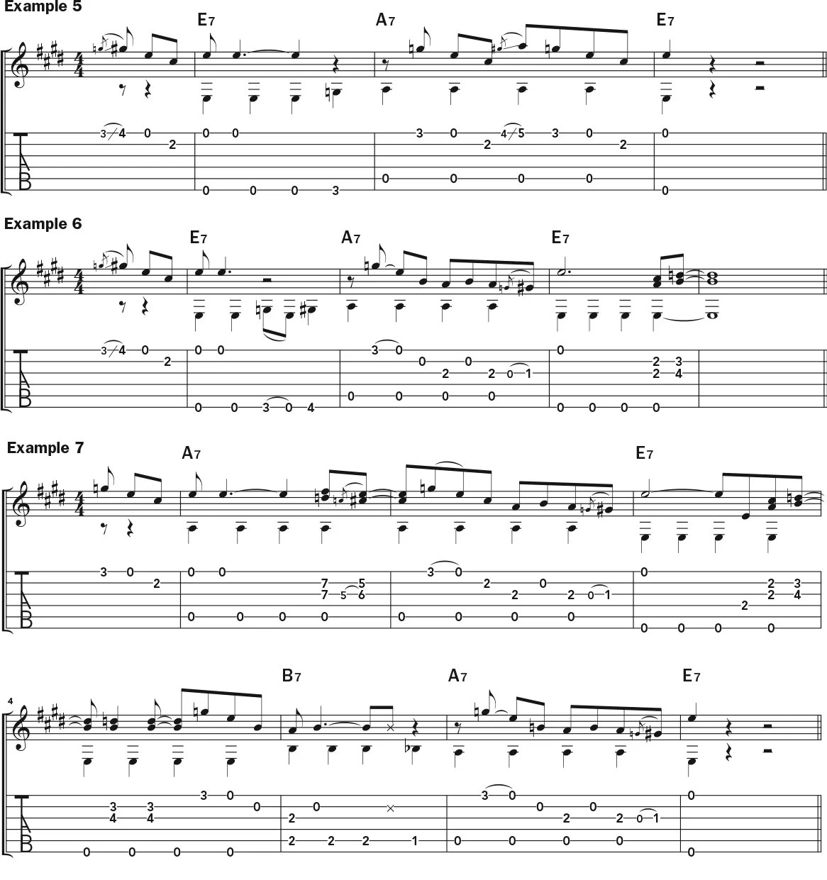 Things are a little different if you play a major third (G#) over the I chord; that note might sound a little weird over the IV, as it clashes with that chord’s flatted seventh (G). So to avoid this problem, just play a lick with G# over the I chord, lowering that note to G for the IV chord, as shown in Examples 5 and 6. Example 7 extends the above concepts to the second and third lines of the 12-bar form. Again, you’re just seeing how far you can take a short phrase and land with it.