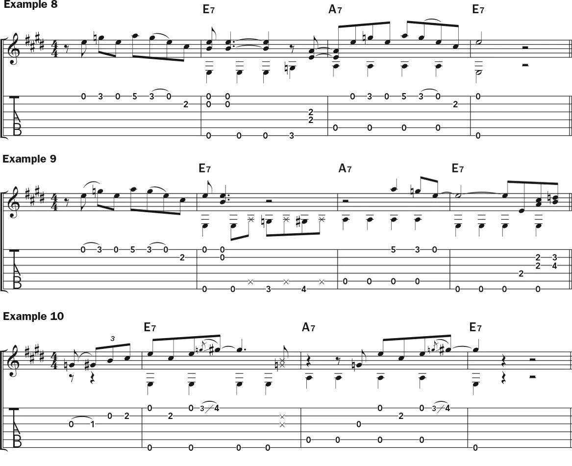 Examples 8 and 9 show how to take a longer pentatonic lick, starting on the “and” of beat 1, and responding with a shorter phrase. In Example 10, things get mixed up with an eighth-note triplet lick including the major third on the I chord. Check out how I avoid the problem of using that G# on the IV chord, by placing it on the “and” of bar 2, beat 4, to anticipate the return to the I in the last measure.