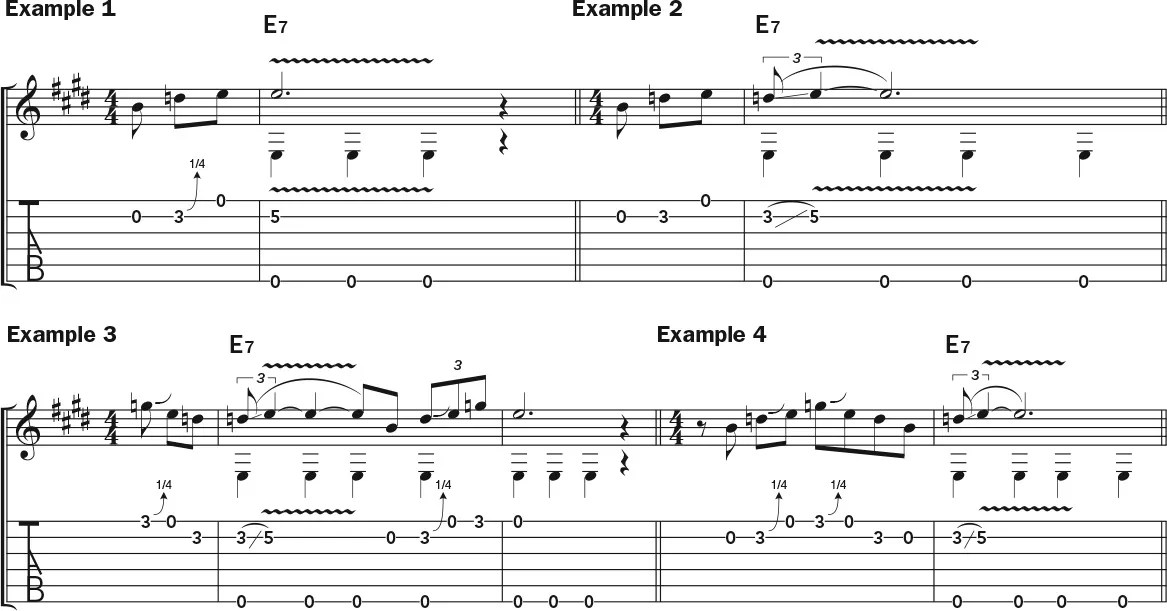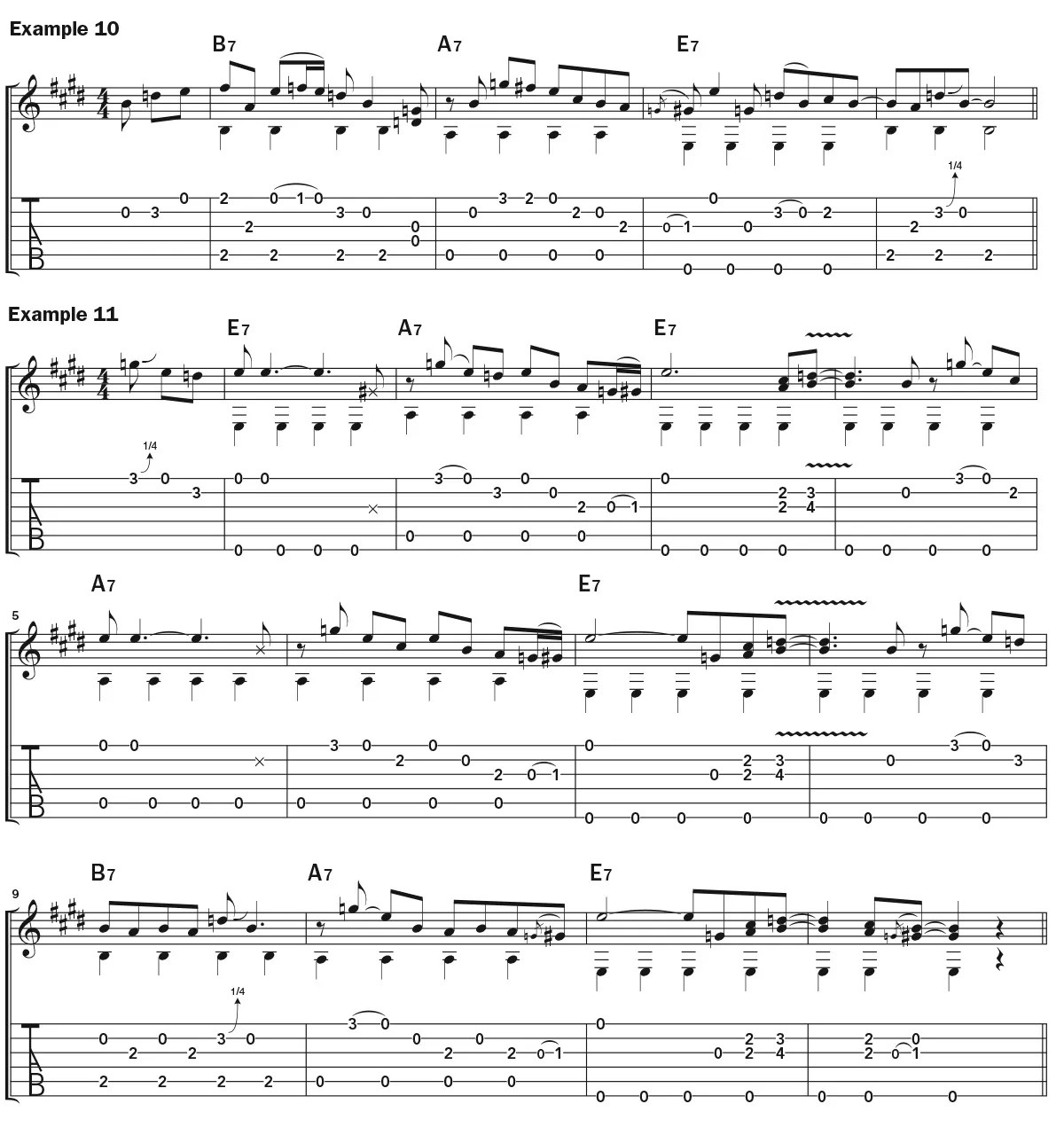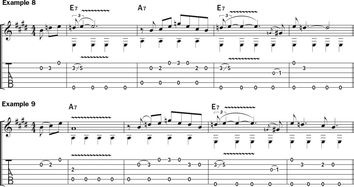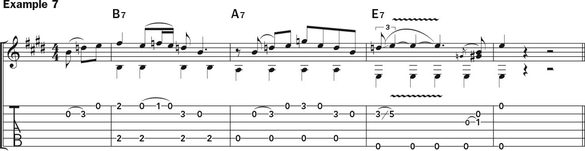 The last four bars of the form see the introduction of the V chord, B7, as shown in Example 7. If you want to resolve to the note B on the B7 chord, you can conveniently find it on the open second string. In this case, the resolution of the starting lick is delayed a bit, landing on the “and” of beat 3. The next lick starts a little earlier, on the “and” of beat 1 in the A7 measure, resolving to the E7 chord in the third bar.