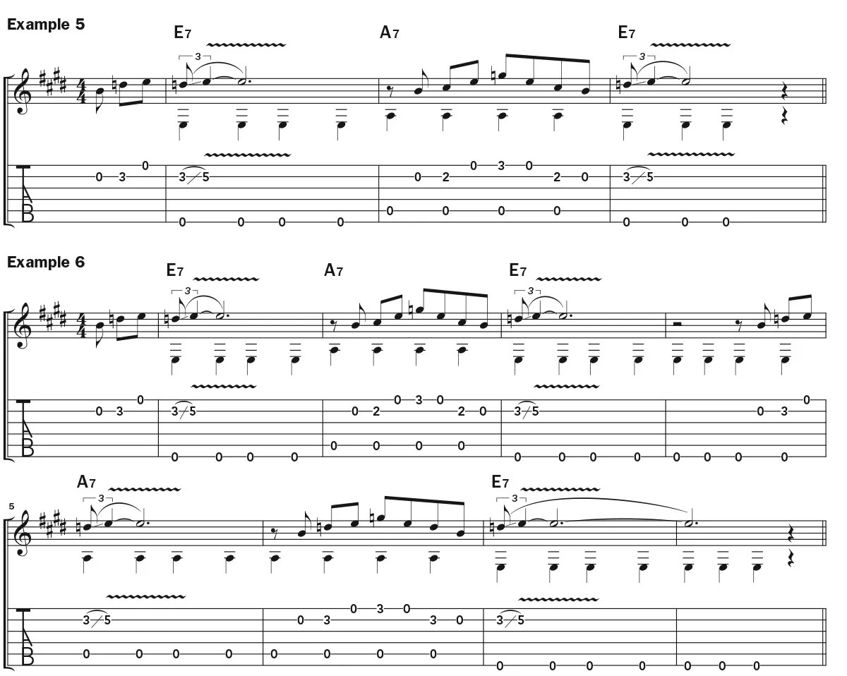 Now let’s look at the first three measures of the 12-bar blues form in E. One way to create a nice call-and-response is to play a short resolution into the downbeat of the first measure, and then, starting on the “and” of beat 1 in the A7 bar, do a longer resolution into the downbeat of the third measure, as shown in Example 5. This is a way that you can start to create some sense of logic and order in your solos without memorizing a bunch of licks or feeling like you’re completely winging it. Example 6 extends the concept to the first eight measures of the 12-bar structure.