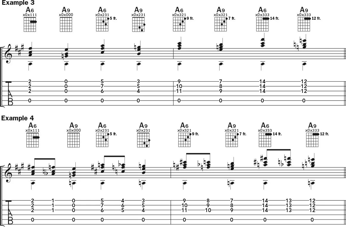 As shown in Example 3, if you take any A6 shape and move it down two frets, you get another really cool and really useful chord, which is A9 (A C# E G B), minus the third (C#). For a jazzy sound, try moving down in half steps to the ninth from the sixth chords (Example 4).