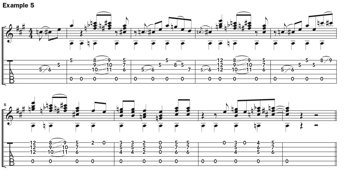 Example 5 combines the chords with jump-blues licks that involve both the minor (C) and major third (C#). The figure starts off with a basic lick (the call) that is answered in the first full bar by a chordal move, this time approaching an A6 from a half step below, resolving to a lower A6 voicing. An extended lick in bar 2 is followed by chords starting on beat 2 of bar 3, and then the call-and-response pattern continues.
