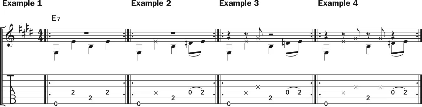 Once you’re comfortable with Ex. 2, try picking additional damped notes on the offbeats with your index finger, first on beat 2.5 (Example 3) and then adding beats 3.5 (Example 4) and 1.5 (Example 5). And so now you’ve got the bones of the groove—the feel behind a lot of those 1950s, barely electrified Muddy Water tunes and some of the Howlin’ Wolf stuff, too.