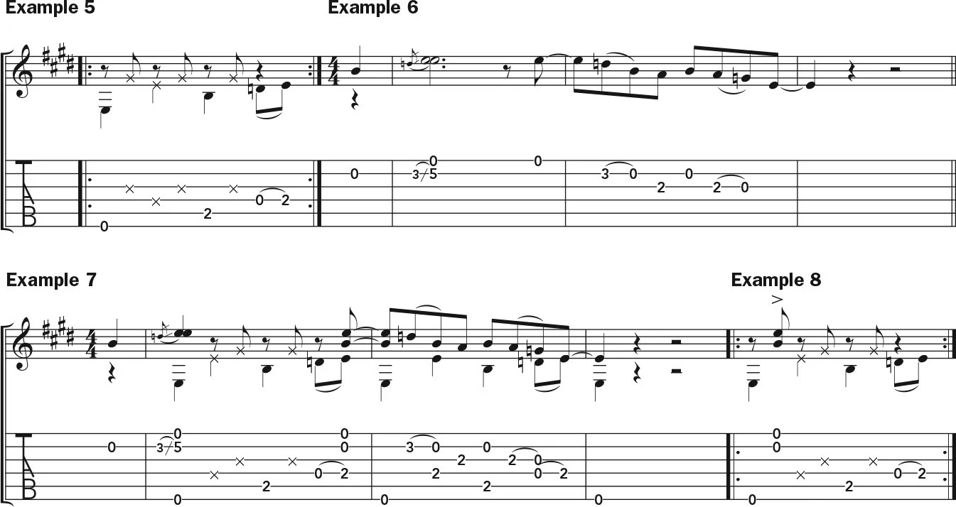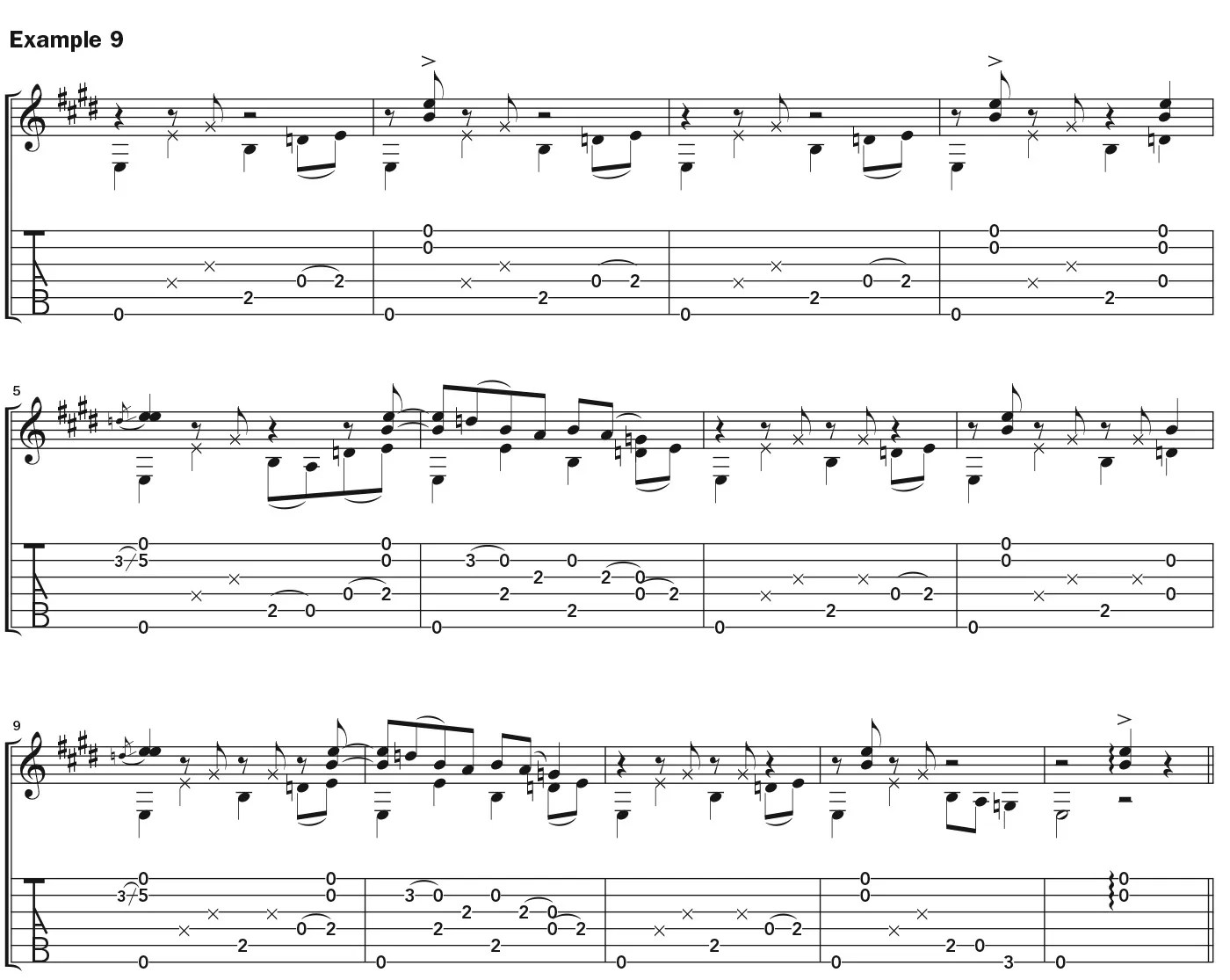 There’s one more thing you can do on the end of beat 1 in the groove, which is to add the top two open strings as a kind of a stab on the “and” of beat 1, before immediately choking them off (Example 8). And now, as shown in Example 9, try playing that idea, as well as this lesson’s other concepts in an extended groove.