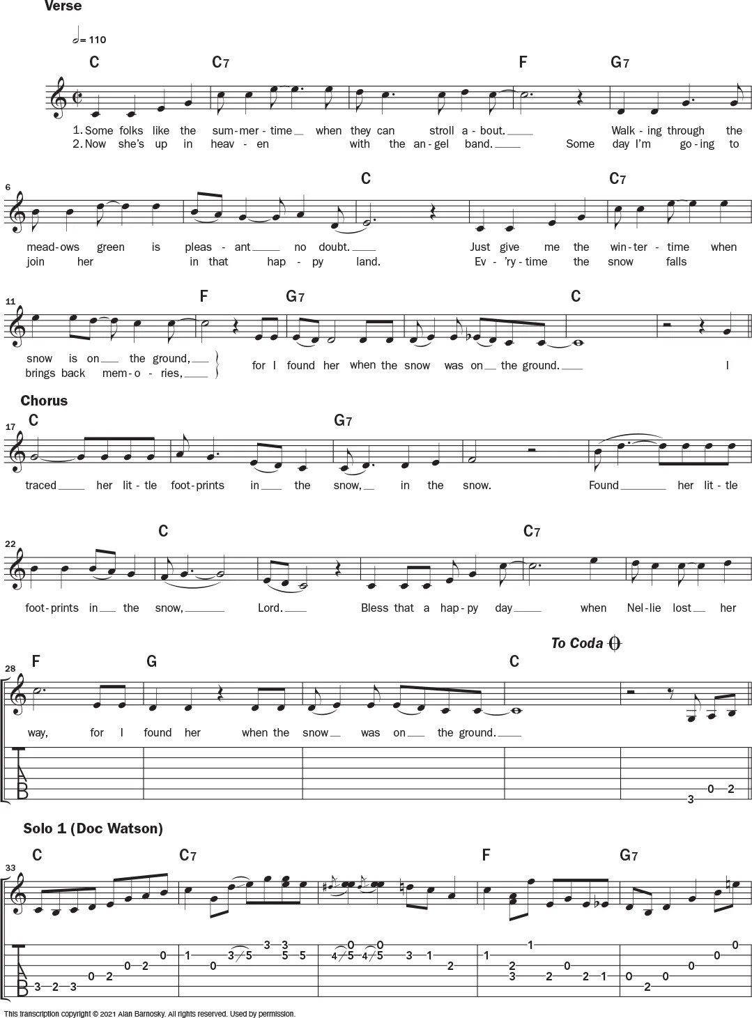 To learn the piece, I would suggest first familiarizing yourself with the melody and the basic chord changes. The song follows a simple structure: a 16-bar verse alternating with a chorus of the same length. I’ve notated the melody to the verse and chorus as sung by Watson, which sits nicely in the open position when played on guitar.