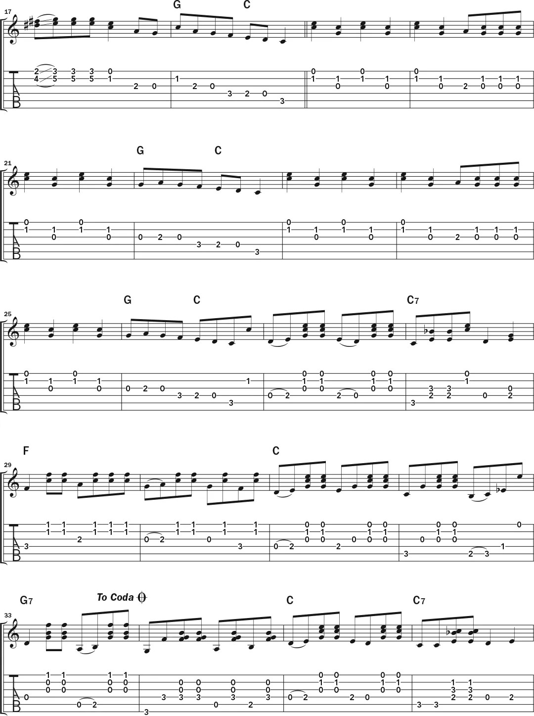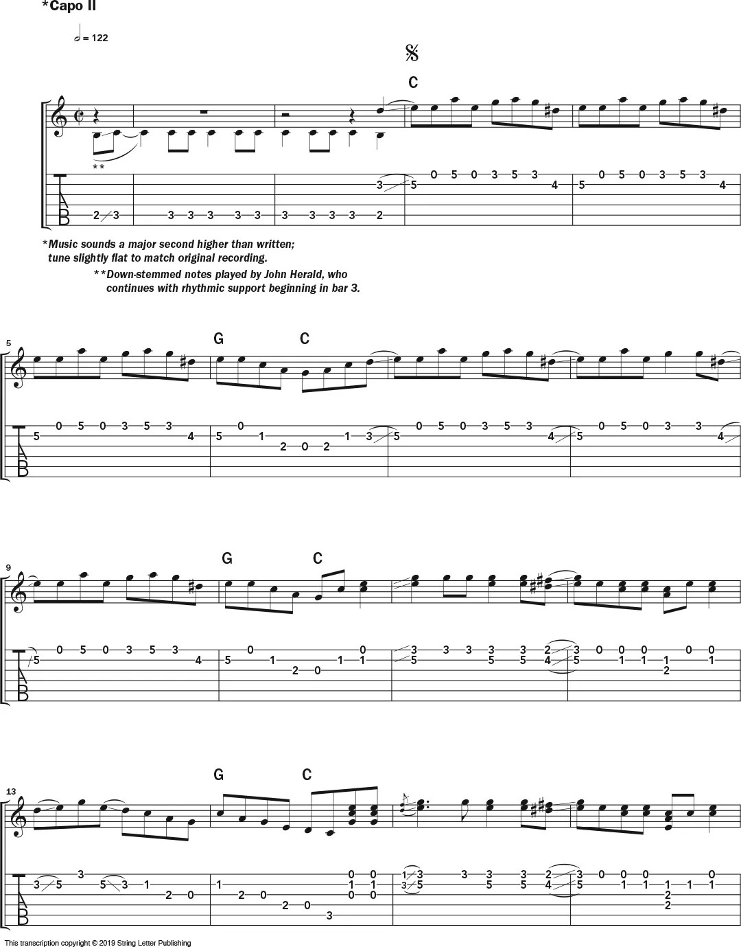 Watson’s 1963 recording of “Black Mountain Rag” (from The Vanguard Years) is a prime example of the guitarist’s exciting treatment of a traditional fiddle tune. For this particular version, a duet with guitarist John Herald, Watson plays the piece in the key of C major, with a capo at the second fret causing it to sound in D. While Herald, whose part is not shown here in notation (save for the lick in the first two bars), lays down a chugging rhythmic accompaniment, Watson plays singing leads. “I’m not sure exactly how he did it,” Minner says. “But I think that because Doc was blind, he was able to concentrate on nuances that escape us mere mortals with sight.”