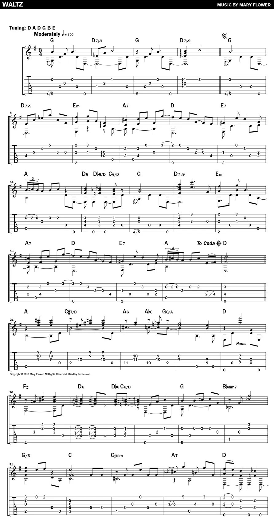 The completed piece for solo guitar—“Waltz”—is heard on Flower’s most recent album, Livin’ With the Blues Again. To play the composition, begin by getting into dropped D. If you’re unfamiliar with this tuning, it’s easy: from standard, just lower your sixth string down a whole step, to D, such that it sounds an octave below the fourth string.