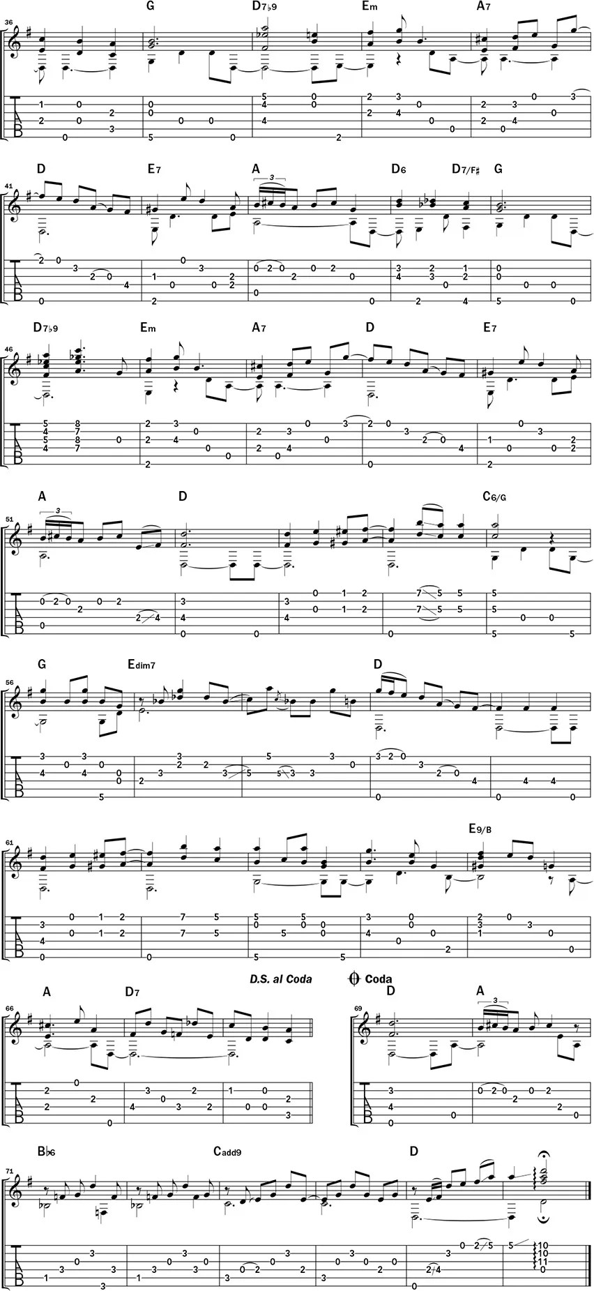 Dropped D is most commonly used for pieces in the key of D major, where the tuning allows for a big-sounding open-D chord with a low D, but “Waltz” is in G major. As is evident in the notation, the composition requires quite a bit of the fretting hand. But the good news is that a bunch of the shapes are moveable, and so things should fall into place once they’re in your muscle memory. For instance, a diminished-seventh shape (fingers 1, 3, 2, and 4 on strings 4, 3, 2, and 1, respectively) is shifted to various locations, like first position in bar 2 and fourth position in bar 6, to form D7b sounds. And only one grip—an A minor shape (fingers 2, 3, and 1 on strings 4, 3, and 2)—is required for the D6–Db6–C6/D move in bar 12 and higher up the neck in measures 23 and 24.