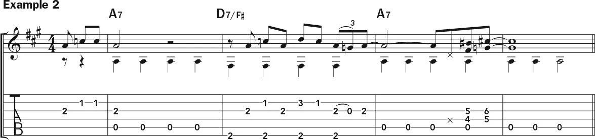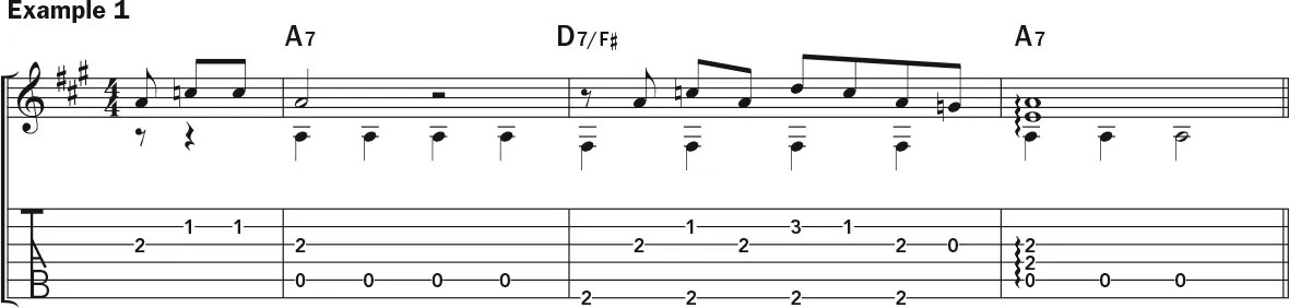 In any case, in the key of A, the I chord is A7 and the IV is D7, which you’ll play with the third (F#) in the bass. Over the first line, try playing a short phrase answered by a long phrase, as shown in Example 1. As before, these licks are based on the minor pentatonic scale, which with a root note of A is spelled A C D E G.